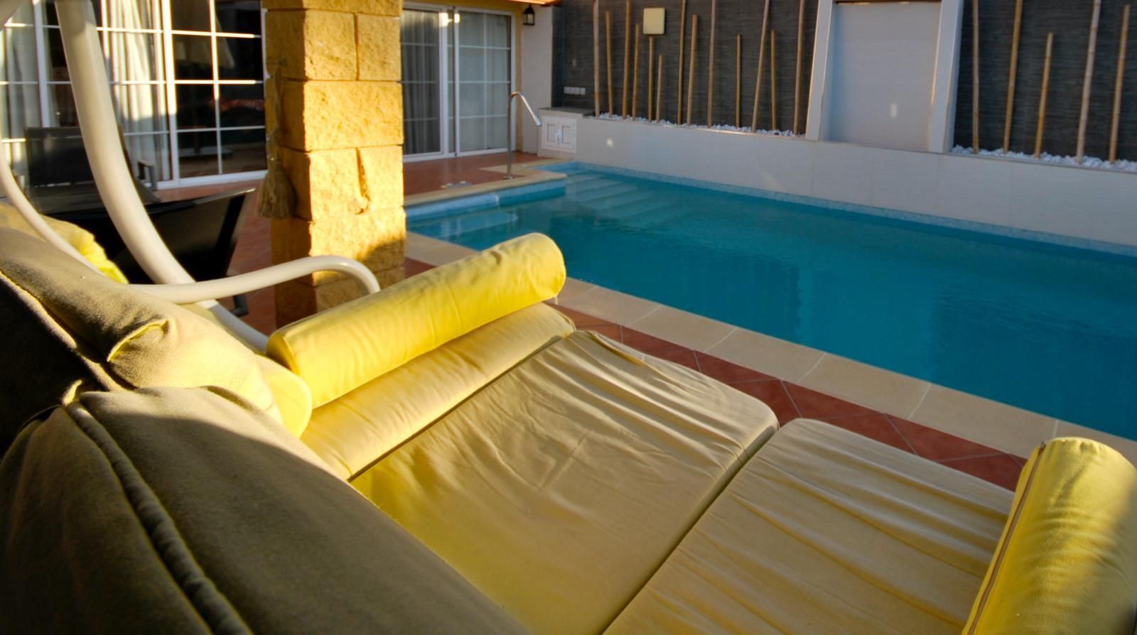 • Privater Außenbereich mit großzügiger Terrasse, Gartenfläche und einem großen privaten Pool – Sonne satt, absolute Privatsphäre